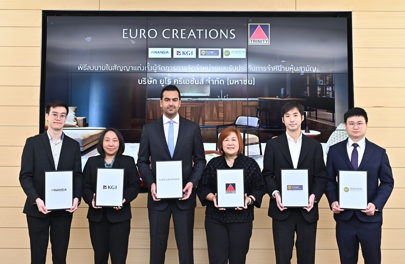 นายเควิน กัมบีร์ (ที่ 3 จากซ้าย) ประธานเจ้าหน้าที่บริหาร บริษัท ยูโร ครีเอชั่นส์ จำกัด (มหาชน) หรือ “EURO” และนางสาวสุธางค์ คนศิลป (ที่ 4 จากซ้าย) ประธานเจ้าหน้าที่สายงานวาณิชธนกิจ บริษัทหลักทรัพย์ ทรีนีตี้ จำกัด ในฐานะที่ปรึกษาทางการเงิน ร่วมพิธีลงนามในสัญญาแต่งตั้งบริษัทหลักทรัพย์ ทรีนีตี้ จำกัด เป็นผู้จัดการการจัดจำหน่ายและรับประกันการจำหน่าย บริษัทหลักทรัพย์ ฟินันเซีย ไซรัส จำกัด (มหาชน), บริษัทหลักทรัพย์ เคจีไอ (ประเทศไทย) จำกัด (มหาชน), บริษัทหลักทรัพย์ กรุงศรี พัฒนสิน จำกัด (มหาชน) และบริษัทหลักทรัพย์ เมอร์ชั่น พาร์ทเนอร์ จำกัด (มหาชน) เป็นผู้จัดจำหน่ายและรับประกันการจำหน่าย เพื่อเสนอขายหุ้น IPO จำนวน 78 ล้านหุ้น ที่ราคาหุ้นละ 10.60 บาท ในวันที่ 31 มกราคม – 2 กุมภาพันธ์ 2567 โดยมีวัตถุประสงค์เพื่อนำไปลงทุนก่อสร้างโชว์รูมใหม่ 3 แห่ง ได้แก่ โชว์รูมทองหล่อ ซอย 1, ทองหล่อ ซอย 5 และภูเก็ต ชำระคืนเงินกู้ยืมจากสถาบันการเงินเพื่อก่อสร้างโชว์รูมใหม่ 3 แห่ง คืนเงินกู้ยืมระยะสั้นสำหรับเงินทุนหมุนเวียน และเป็นเงินทุนหมุนเวียนในกิจการและการขยายธุรกิจ โดยคาดว่าจะนำหุ้นเข้าจดทะเบียนและซื้อขายในตลาดหลักทรัพย์ เอ็ม เอ ไอ ภายในเดือนกุมภาพันธ์นี้